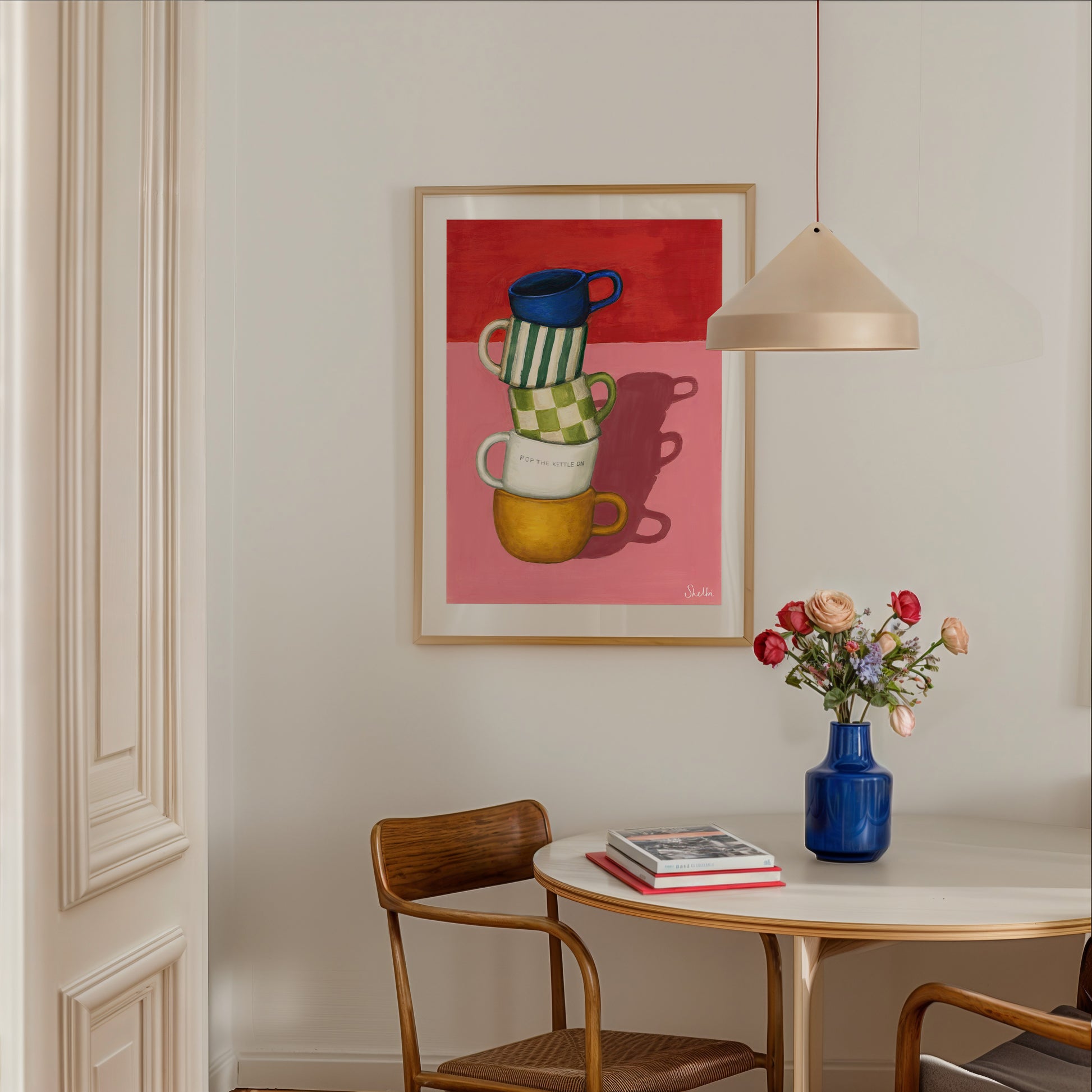 A colourful ode to everyday comfort, Pop the Kettle On features a playful stack of mugs painted in rich gouache tones. It’s a joyful reminder to slow down, brew up, and enjoy life’s simple pleasures.